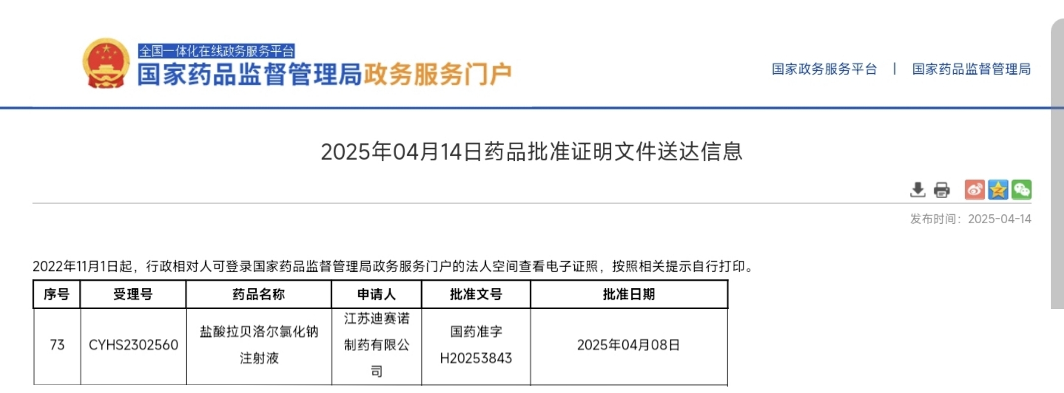 的盐酸拉贝洛尔氯化钠注射液(国药准字H20253843)成功获得国家药品监督管理局(NMPA)批准上市,该产品是公司的化药3类仿制药,是该品种药物的国内首仿。这一成果标志着公司在心血管领域的产品布局迈上新台阶,也为广大患者提供了更优质的用药选择。
